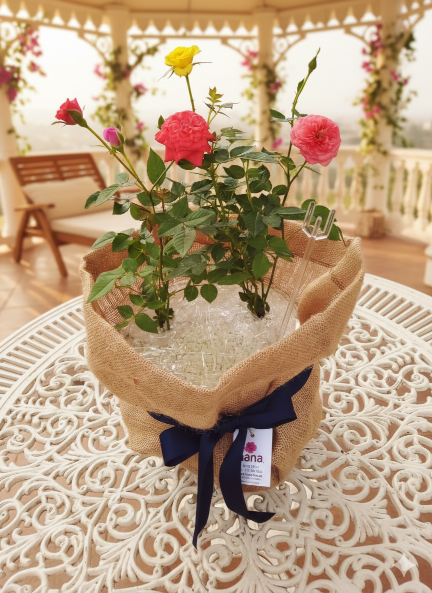 Planta de rosa con amarre en yute y cinta. Incluye oración y tarjeta.